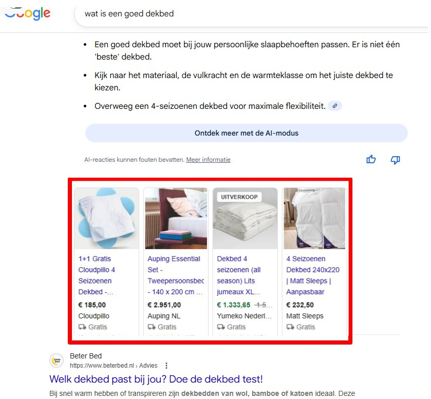 Google AI Overviews: In Google kunnen je klassieke Search- en Shopping-advertenties nu ook binnen of naast de AI-samenvatting verschijnen. Op dit moment is het nog niet mogelijk om dit uit te schakelen en zijn de rapportages nog niet afzonderlijk beschikbaar. In de praktijk betekent dit dat je via bestaande campagnetypen werkt, maar dat je advertentie-assets geschikt moeten zijn om in de context van een AI-gesprek getoond te worden. Google Help